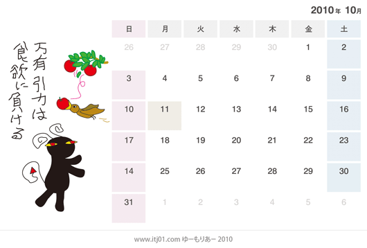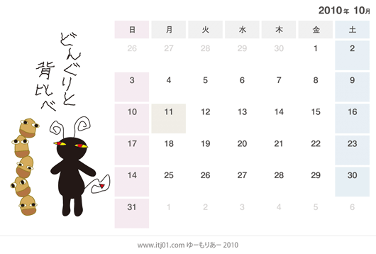 イラストと言葉で綴るユーモア壁紙サイトゆーもりあーオリジナルの卓上カレンダーのイラストです。 カレンダーのサイズは普通のハガキの大きさ(ポストーカードサイズ)です。 ハガキサイズだけど、A4用紙にプリントしても大丈夫だと思います。プリント位置を調節してみてください。 ご利用無料なので、必要な月だけでも、全部の月でも、何枚でも、好きなだけプリントして使ってください。 このページにある画像は、デザイン確認用のサムネイルなので、それぞれの画像をクリックした先にあるプリント用の大きな画像をご利用ください。(カレンダーの使い方★PCの壁紙としても使えます。
